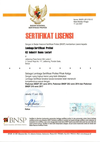 LSP K3 Industri Buana Lestari merupakan LSP yang memiliki lisensi dari Badan Nasional Sertifikasi Profesi (BNSP) dengan nomor BNSP-LSP-2155-ID tanggal 17 Juni 2022.